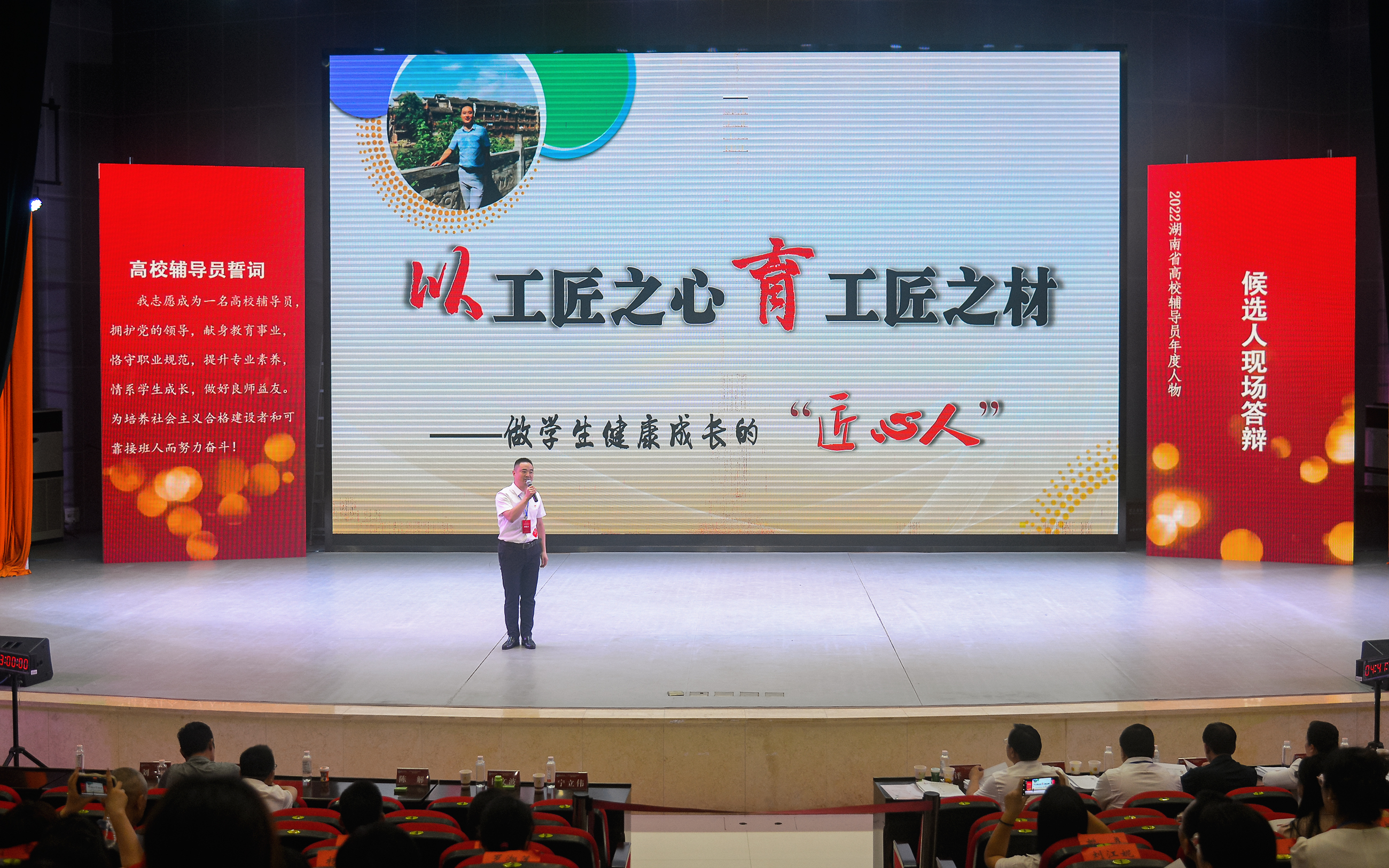 答辩现场,柴斌以《以工匠之心育工匠之材——做学生健康成长的“匠心人”》为主题,从用“赤”心,培育“工匠之星”;用“勤”心,塑造“工匠之材”;用“爱”心,成就“工匠之梦”三个方面进行了展示,凭借出色的答辩表现获得现场评委的认可与肯定,被评为“2022湖南省高校辅导员年度提名人物”。