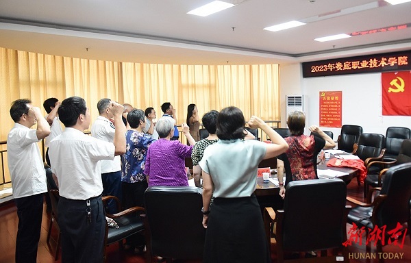 会议伊始,全体党员面向鲜红党旗,举起右拳,重温入党誓词。娄底职业技术学院党委副书记、校长张征澜为9名老党员佩戴“光荣在党50年”纪念章,并向老党员们汇报了今年上半年学校工作取得的良好成绩,表示成绩的取得离不开老党员们打下的坚实基础,希望各位老党员继续为学校发光发热,同时给老党员们送上了真诚的祝福。