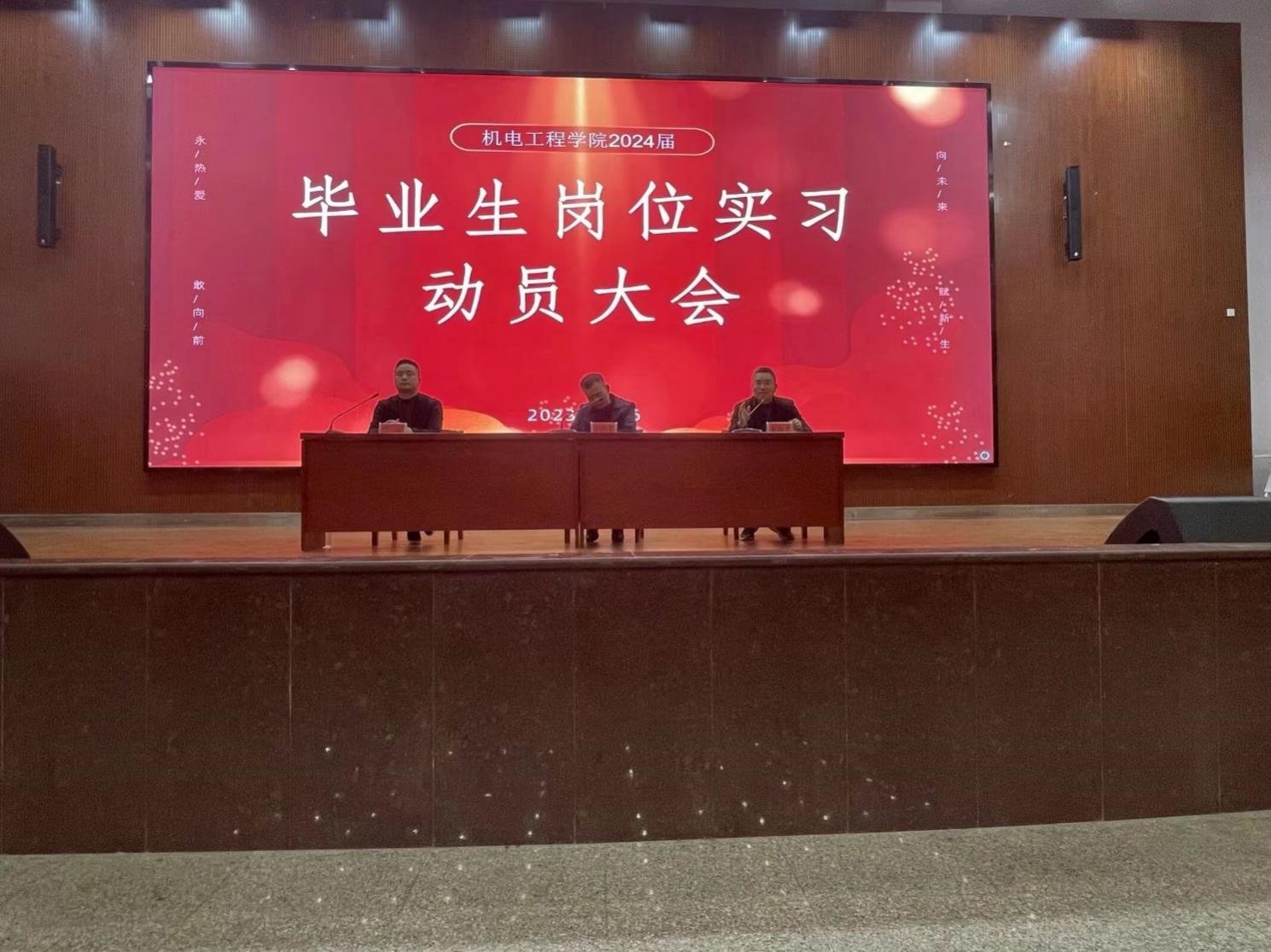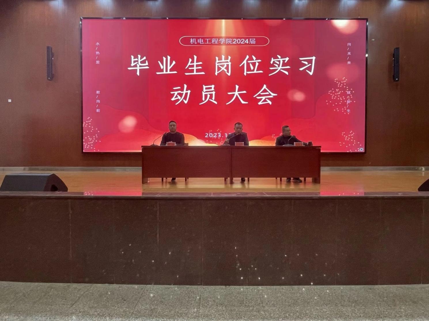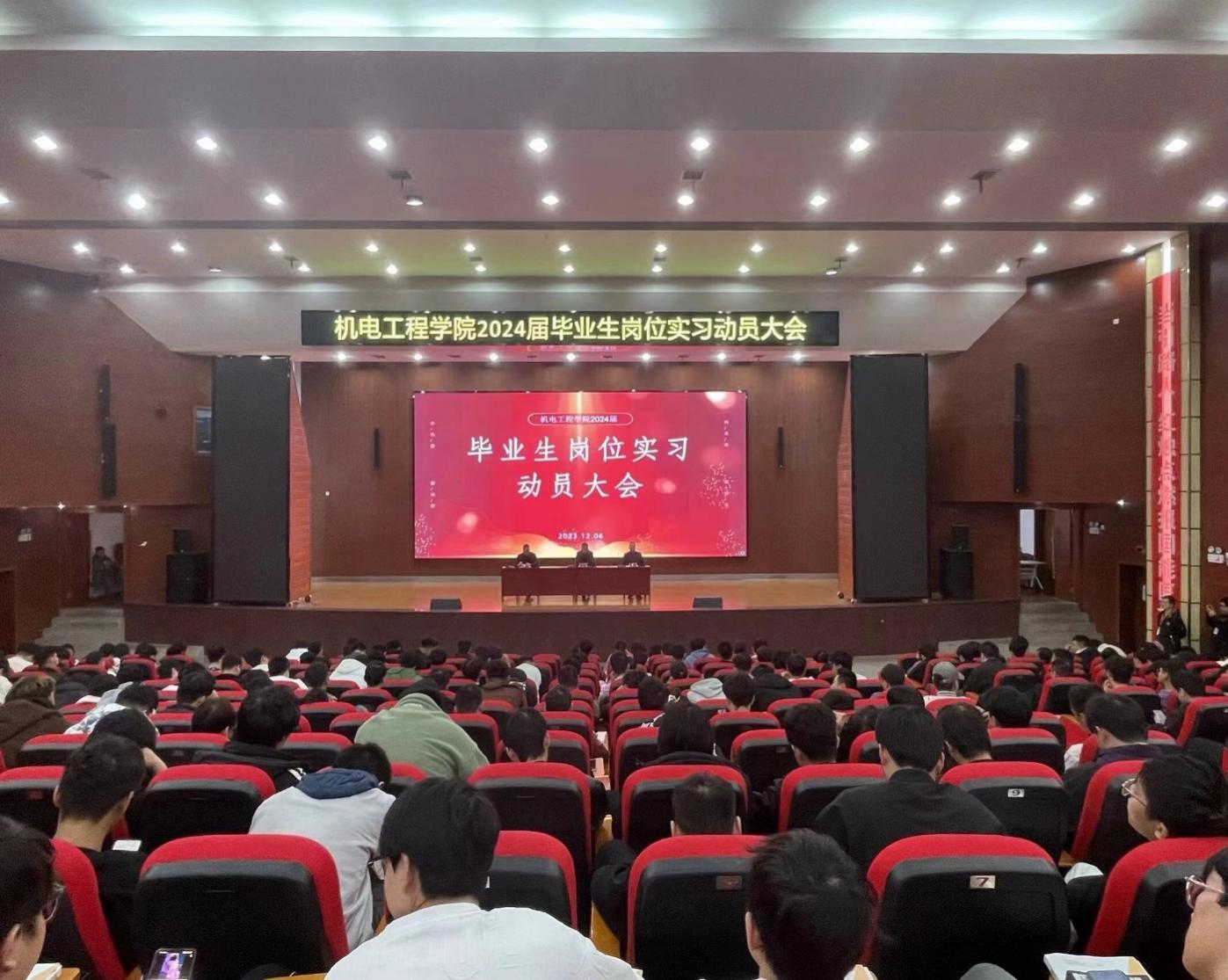 机电工程学院于12月6日午,在学术报告大厅举行2024届毕业生岗位实习动员大会,参与人员有党总支书记梁艳丰、副院长龙育才、副院长柴斌、毕业班级辅导员以及全体2024届毕业生,本次会议由梁艳丰书记主持。