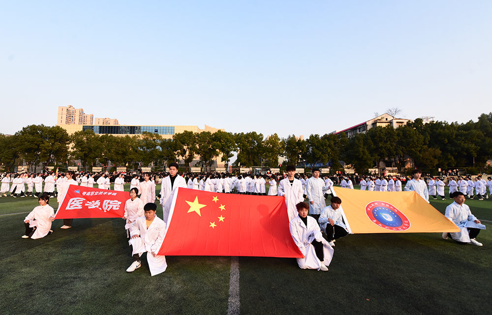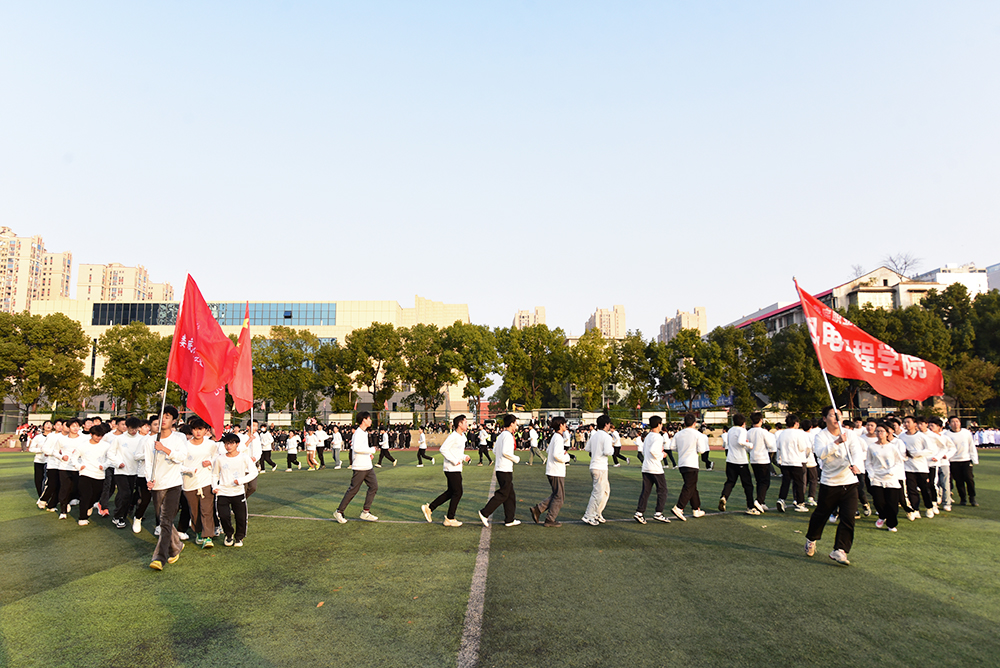 在激昂的进行曲和阵阵掌声中,各二级学院方阵有序入场。比赛中各方阵以整齐划一的步伐,新颖别致的造型、独具特色的跑操线路和队形排列使得比赛精彩纷呈、高潮迭起。我校学子们一个个昂首阔步、精神抖擞,用自己的自信和朝气,点燃了现场的青春激情,跑出了自己的花样年华。
