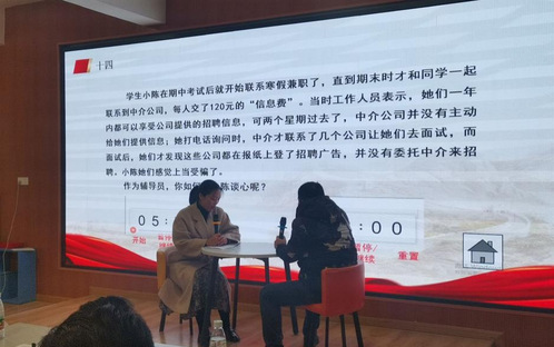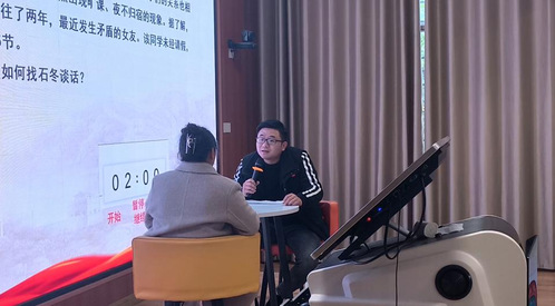 谈心谈话主要考察辅导员对学生特征、学生成长成才规律的了解把握程度,对学生的教育引导、帮助学生解决困惑等方面的能力。比赛以情景再现的方式,重现辅导员与学生围绕就业指导、学习生活、人际交往等热点话题面对面谈话的情景。在沟通过程中,参赛选手把脉问诊、循循善诱,结合工作实际,耐心倾听、用心交流,准确把握谈话核心,积极开展教育引导,充分展现了我校辅导员作为青年大学生知心人、热心人、引路人的专业素养和育人温度。