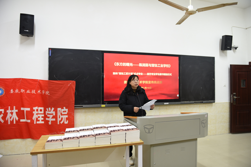 为传承楚怡工匠精神,培养学生爱读书读好书的良好习惯,1月18日上午,在“楚怡·园艺”——学习竞赛活动周启动仪式上,学校党委宣传统战部在主教学楼505室为我校“楚怡工匠计划“试点专业——园艺专业学生赠送了《东方的曙光——陈润霖与楚怡工业学校》图书。宣传统战部副部长刘艳,农林工程学院院长禹华芳,副院长王琦、谢大识,辅导员肖姣娣、周永胜、周凌博老师参加了本次活动。