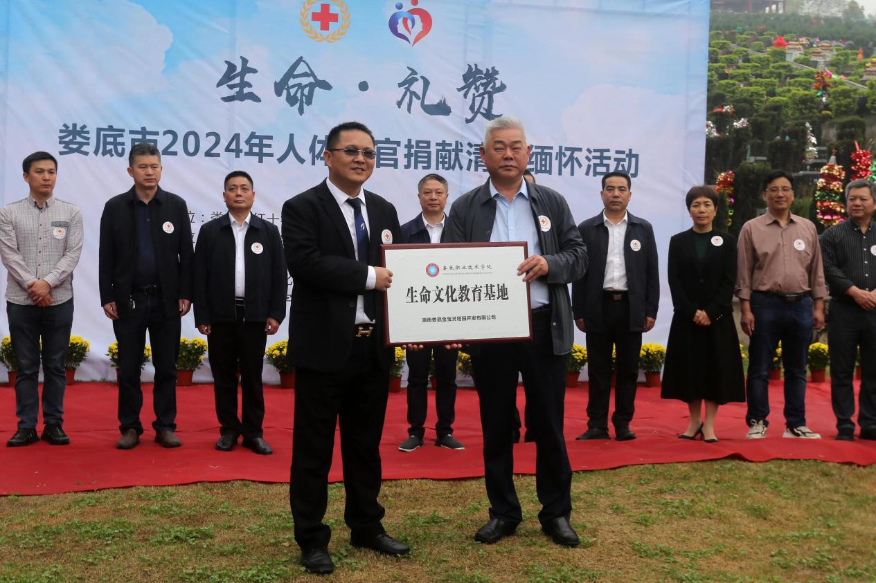 金建雄为娄底金宝灵塔园颁发了娄底职业技术学院医学部“生命文化教育基地”牌匾。这一举措标志着金宝灵塔园不仅只是人体器官捐献者的安息之地,也是教育学生的育人之地,既是生命的结束地,也是教育的延续地。