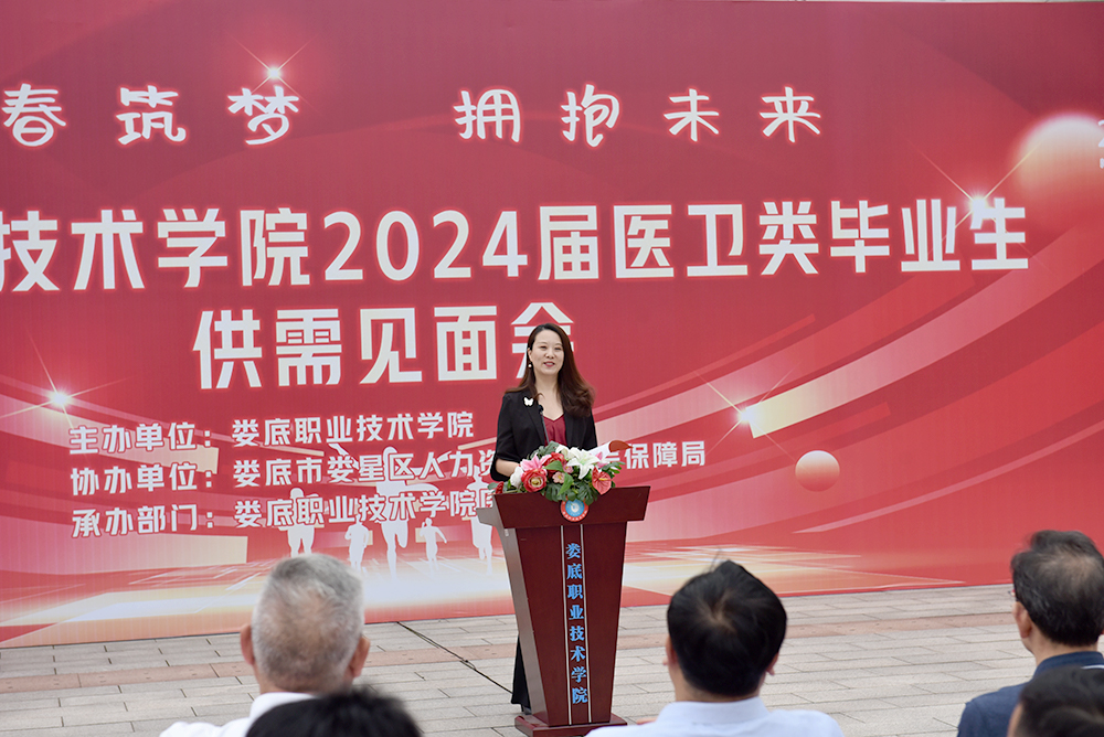 5月9日,我校医学部举办了2024届医卫类毕业生供需见面会。娄底市人力资源和社会保障局副局长曾春谷,娄底市教育局副局长李静,娄底市人力资源和社会保障局就业科科长袁玲,娄底市教育局职成科科长曾腾飞,娄底市教育局就业科科长肖姝,娄星区人力资源和社会保障局党组书记、局长李建宏等相关领导出席。党委书记张征澜,副校长金建雄、周志和,招生就业处处长李泉良,医学部常务副主任范国正,医学部党总支书记吴群雄及医学部相关职能部门负责人参加活动。活动由周志和主持。
