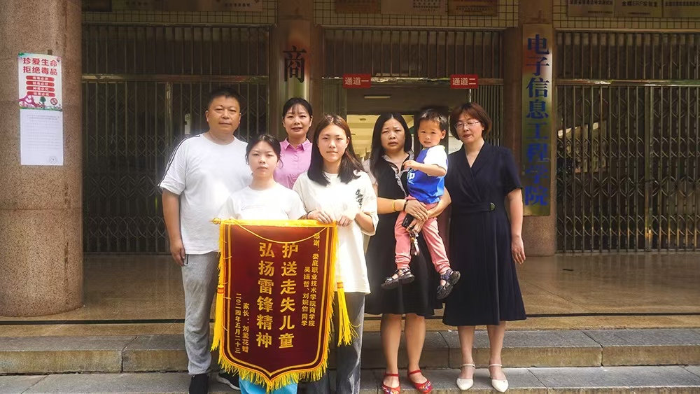 5月21日上午10点,吴婳哲和刘婉怡同学在上学的路上(石马公园北门附近)遇到一名与家长走失的2岁多男孩,当时他独自在马路上奔跑,车来车往,情况很危险。两位同学见状马上把小孩带到路边询问,并耐心等待家长。由于年幼,男孩无法准确说出家长姓名、电话号码等信息。在这种情况下,两位同学马上向辅导员报告,并亲自护送男孩到了乐坪派出所。经派出所多方联系,终于联系上了孩子的母亲。与此同时,商学院学工副院长周雯婷和辅导员邹慧鹏也赶到了乐坪派出所贤童社区警务室,在警察的见证下把男孩交给了赶来的家长。孩子母亲眼含泪光,对两位学生感谢。“全家人到现在还都后怕不已,幸亏孩子遇到了你们,不然后果不堪设想。”送锦旗时,男孩的家长激动的说。