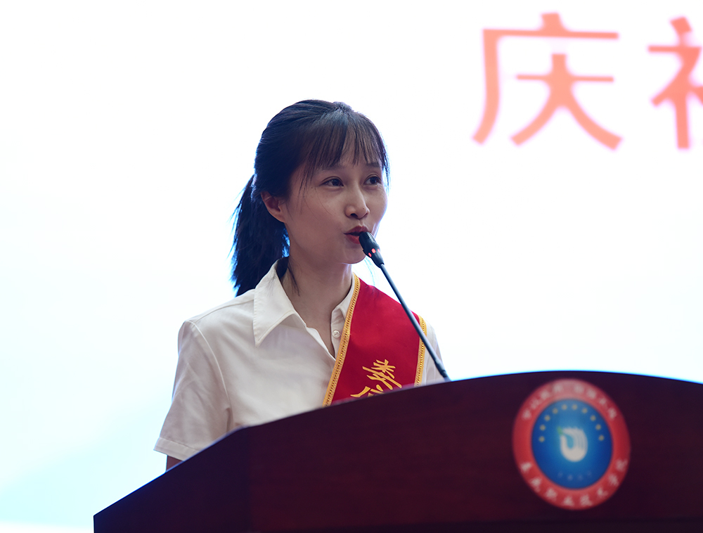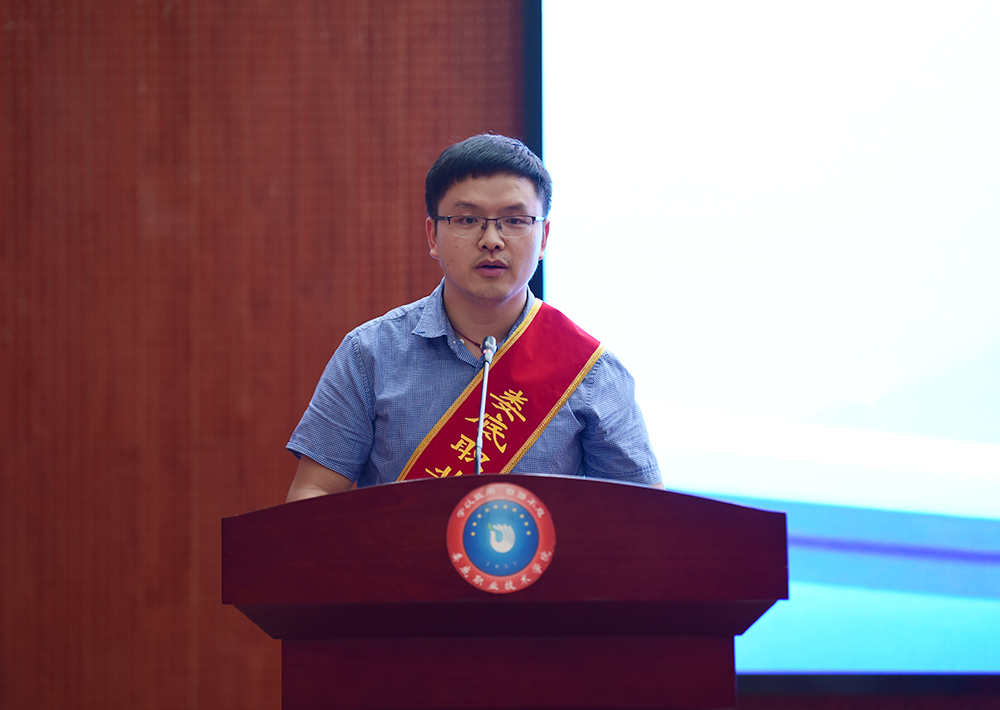 优秀教师代表周凌博分享了耕耘于职业教育一线所经历的挑战与艰辛、收获的成长与幸福,讲述了通过追忆教育救国先贤们的精神,激励他不懈探索与实践的心路历程,他表示将秉承初心、坚定信念,与大家共同携手书写娄底职院高水平建设的新篇章。