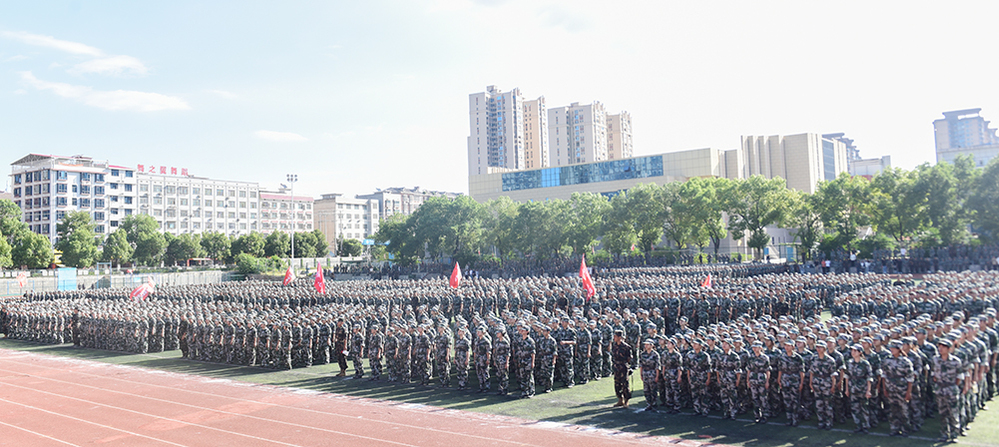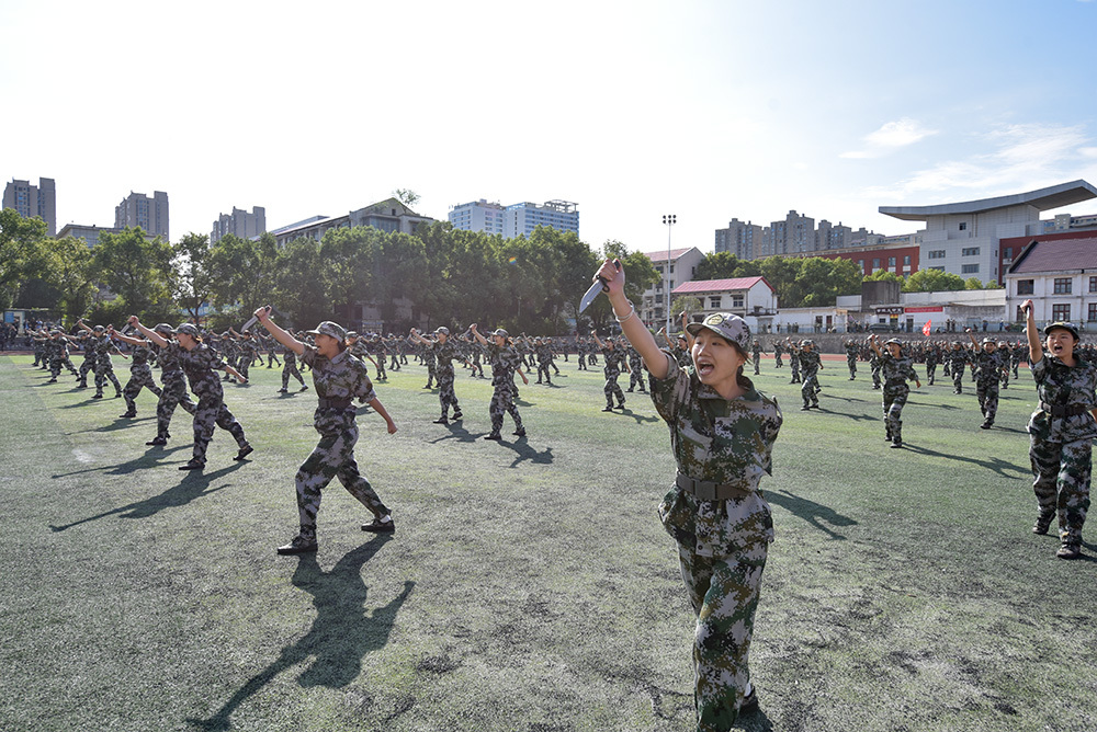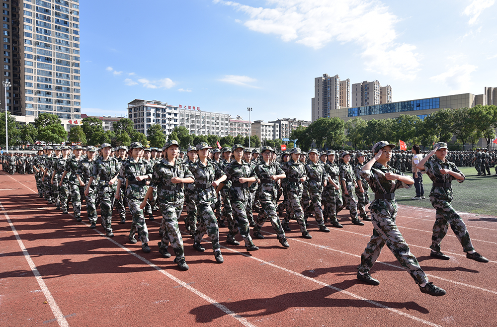 军训总结大会在庄严的国歌声中拉开帷幕。随着党委书记张征澜宣布军训汇演开始,历经两周军训淬炼后的6000余名新生在总教官彭军的指挥下,分为26个方阵队接受检阅,分别进行了拳术、刀术方阵及分列式的展示。