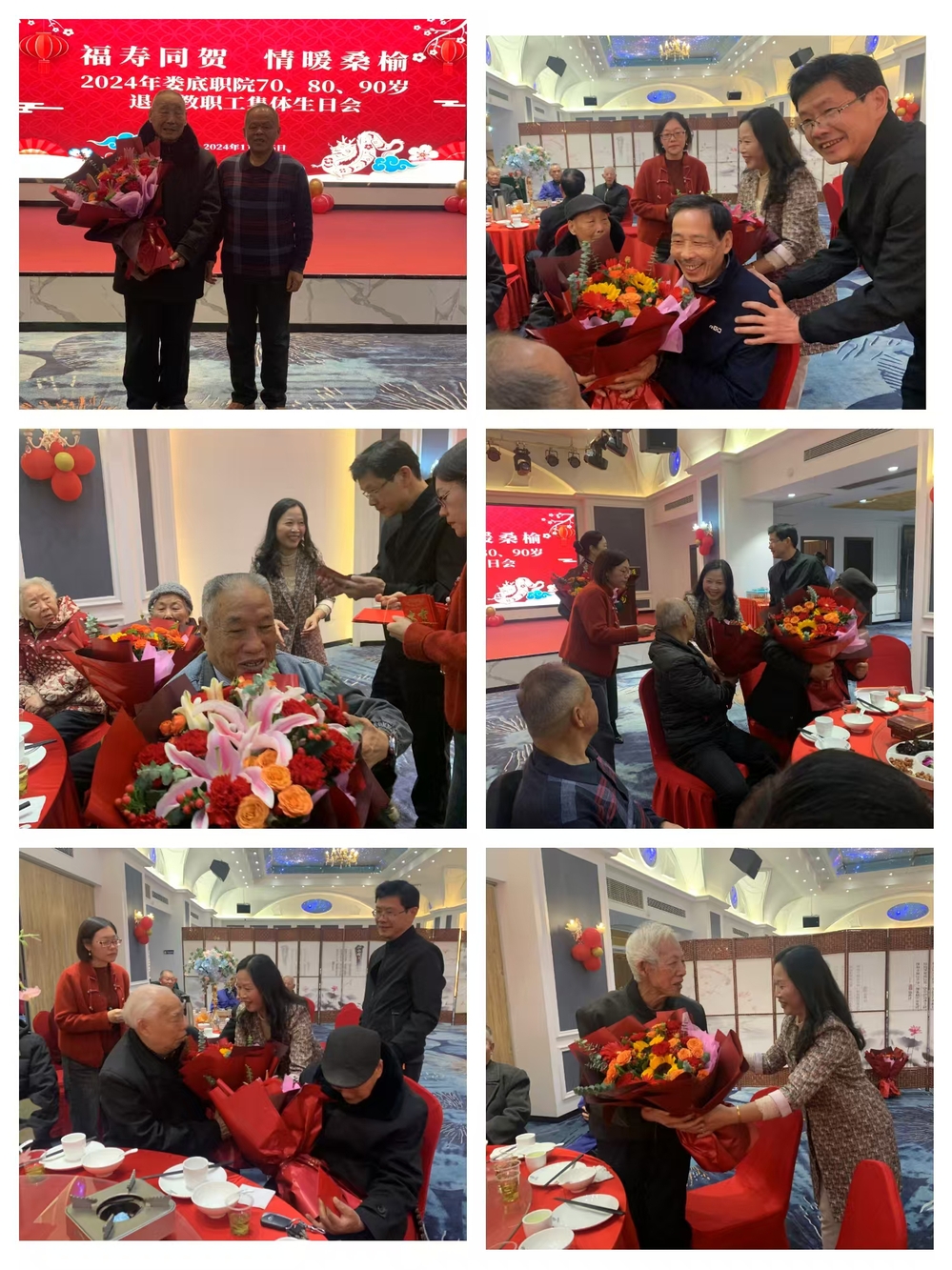 庆祝活动精彩纷呈,切蛋糕仪式上,全场齐唱生日歌,四位九十高龄的寿星共同执刀,缓缓切开那象征着甜蜜与幸福的生日蛋糕。学院还贴心地为每位寿星准备了鲜花,并组织大家合影留念,用镜头捕捉这些珍贵瞬间。