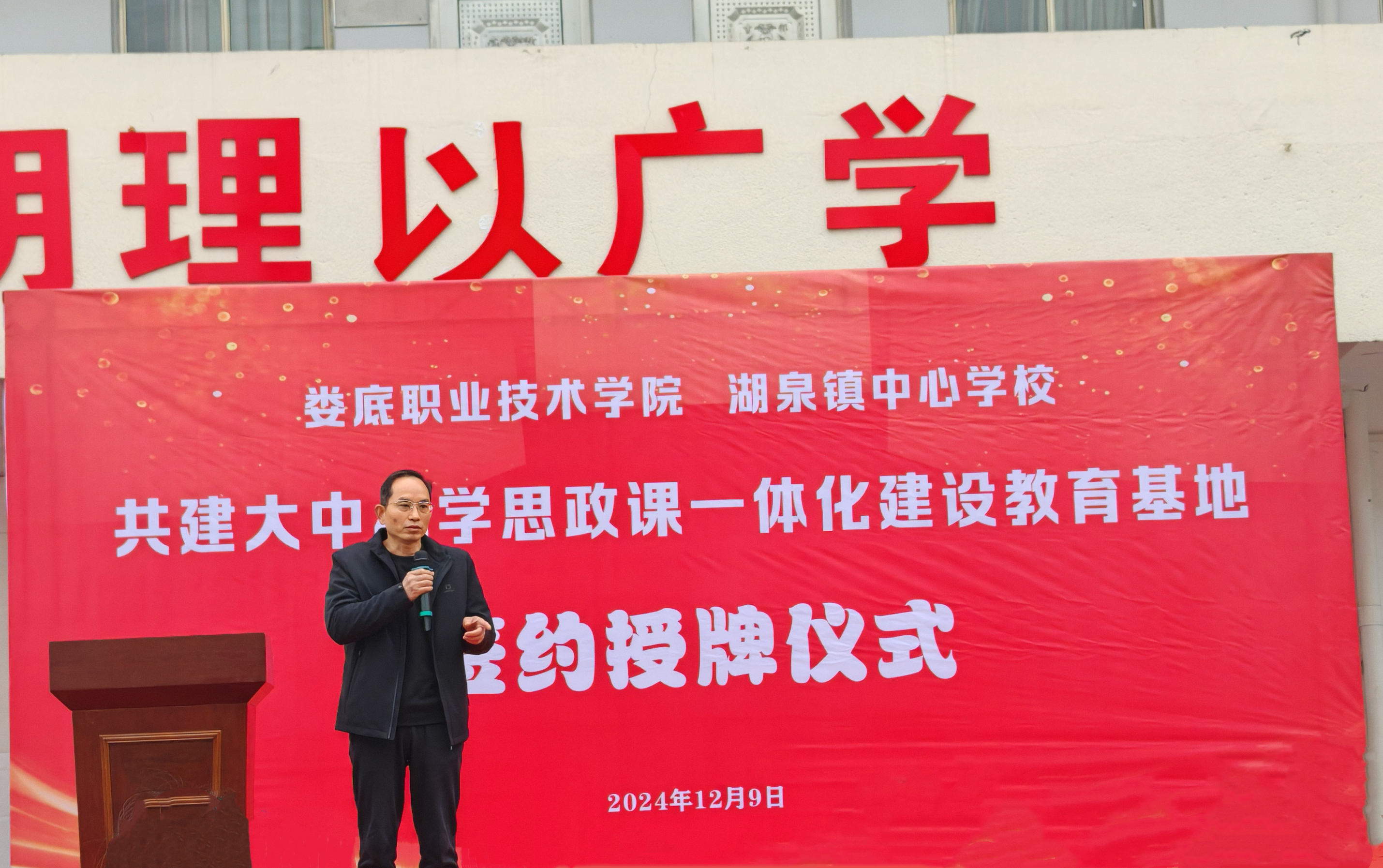为深入学习贯彻党的二十届三中全会精神,进一步贯彻落实习近平总书记对学校思政课建设作出的重要指示精神,12月9日,娄底职业技术学院与湖泉镇中心学校共建大中小学思政课一体化建设教育基地签约授牌仪式在涟源市湖泉镇中心学校举行。我校党委书记张征澜、党委委员副校长龙国锋、党政办主任毛凌云、公共课部主任付鹏、思政课部教师及校友办工作人员出席了活动。