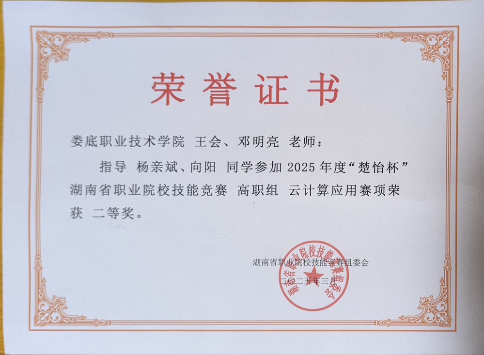 云计算赛项 获 二等奖1项(指导老师:王会、邓明亮,获奖学生:计算机网络技术专业学生杨亲斌、向阳)