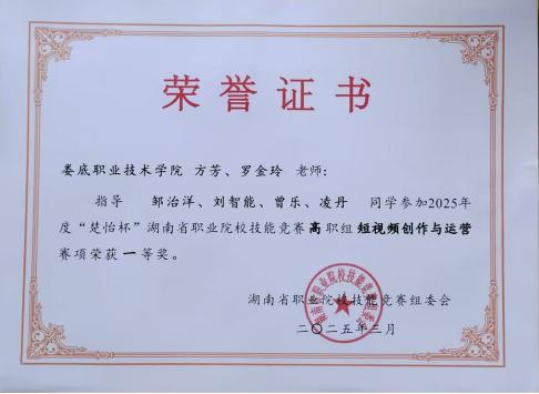 短视频制作与运营赛项 获 一等奖1项(指导老师:方芳、罗金玲,获奖学生:计算机网络技术专业学生刘智能 、曾乐 ,大数据技术专业学生凌丹 、邹治洋)