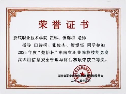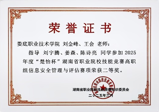 信息安全管理与评估赛项 获 二等奖1项(指导老师:刘金锋、王会,获奖学生:计算机网络技术专业学生刘宇腾、陈诗亮、姜森),三等奖1项(指导老师:汪琳、伍锦群,获奖学生:计算机网络技术专业学生张俊杰、田诗桐、贺涵钰)
