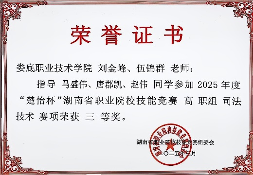 司法技术赛项获二等奖1项(指导老师刘金峰、汪琳,获奖学生:计算机网络技术专业学生沈亮、刘师师、文恬),三等奖1项(指导老师刘金峰、伍锦群,获奖学生:计算机网络技术专业学生马盛伟、赵伟、唐郡凯)