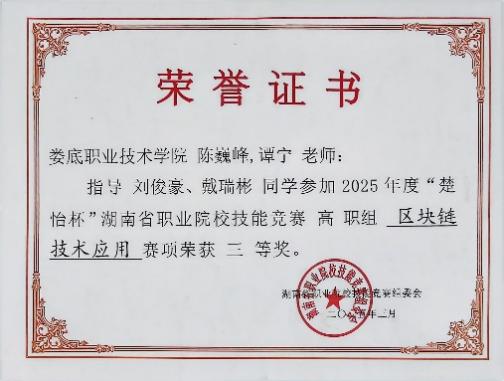 区块链技术应用赛项 获 三等奖2项(指导老师:陈巍峰、谭宁、胡双炎,获奖学生:软件技术专业学生刘俊豪、戴瑞彬、董欣怡、文艺)