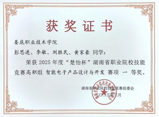 智能电子产品设计与开发赛项获一等奖1项(指导老师:吴水平、李龙云,获奖学生:应用电子技术专业学生彭思进、李敏、刘胜民、黄家豪),三等奖1项(指导老师:吴水平、李龙云,获奖学生:应用电子技术专业学生曹润达、屈思侯、邓敏、欧阳一岚)