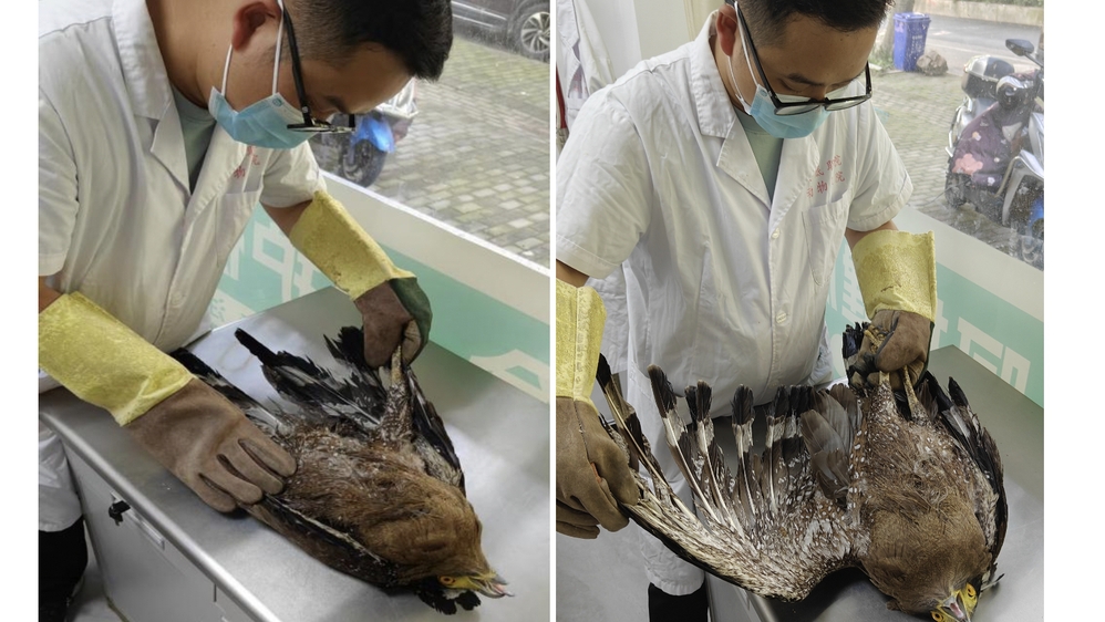 图1 收容救护中心主任、学院党员示范岗王先坤同志在给受伤的蛇雕做检查