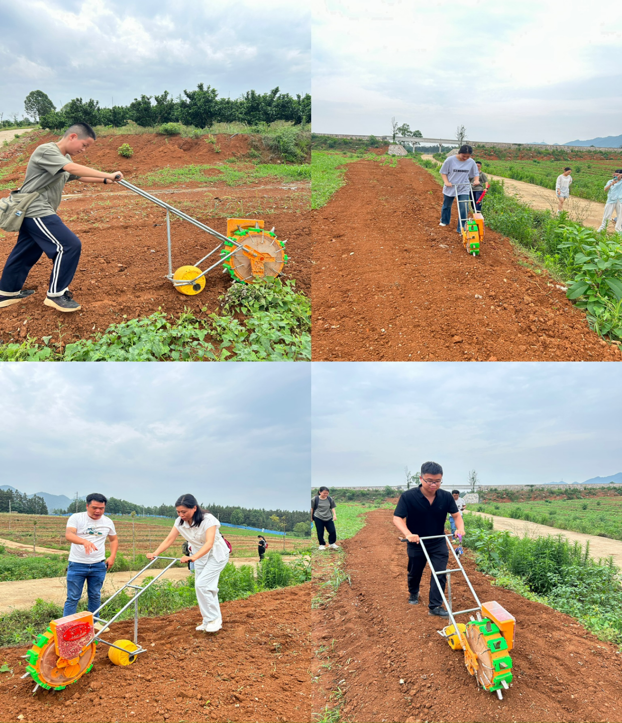 讲座结束后,娄底祥兴农业有限公司负责人带领师生员工和附近村民走进种植基地,开启实操教学环节。在花生种植区域,技术人员现场演示了“手推式播种机器”的操作方法。师生们纷纷上手体验,小巧便捷的播种机让传统播种变得高效有趣,大家在实践中直观感受到现代农业机械的魅力。