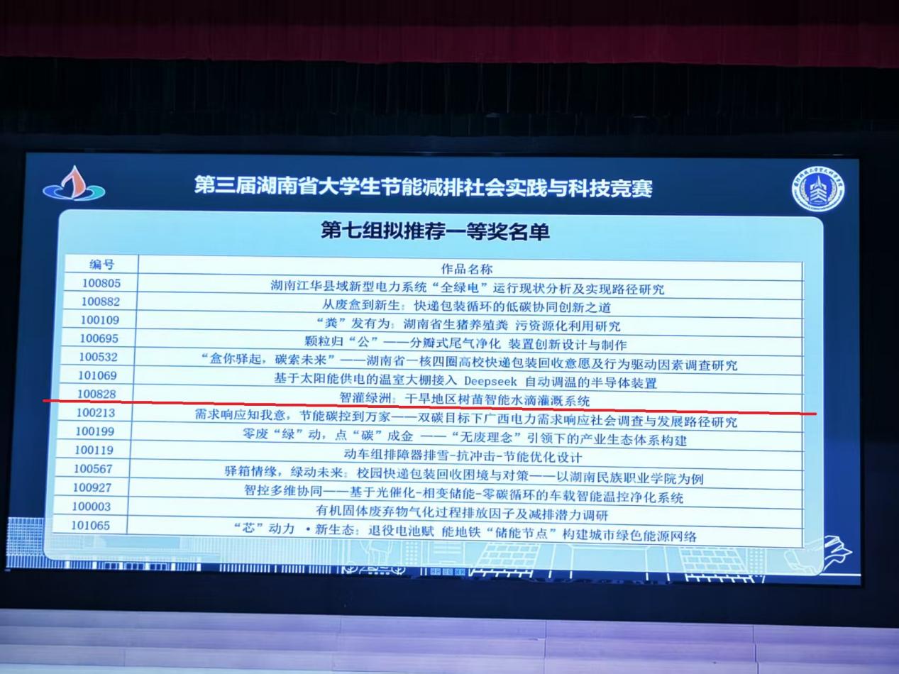 7月13日,第三届湖南省大学生节能减排社会实践与科技竞赛决赛在国防科技大学圆满落幕。我校机电工程学院选送的项目“智灌绿洲:干旱地区树苗智能水滴灌溉系统”获得一等奖。我校已经连续三届在此赛事中获得了一等奖。