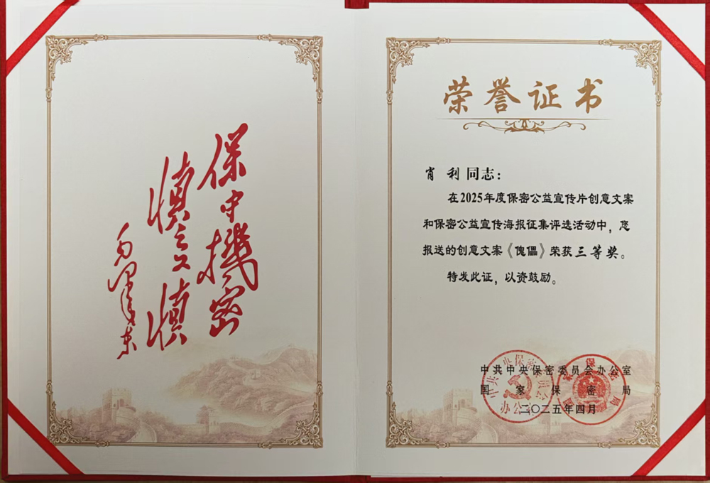 近日,我校教师在中央保密办(国家保密局)、市委保密办(市国家保密局)组织开展的2025年度保密公益宣传片创意文案和保密公益宣传海报征集比赛中表现突出,斩获多项荣誉。
