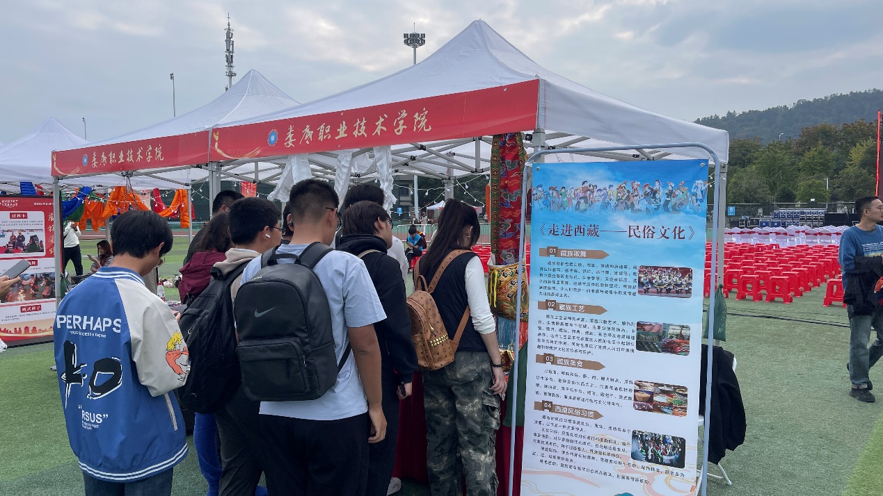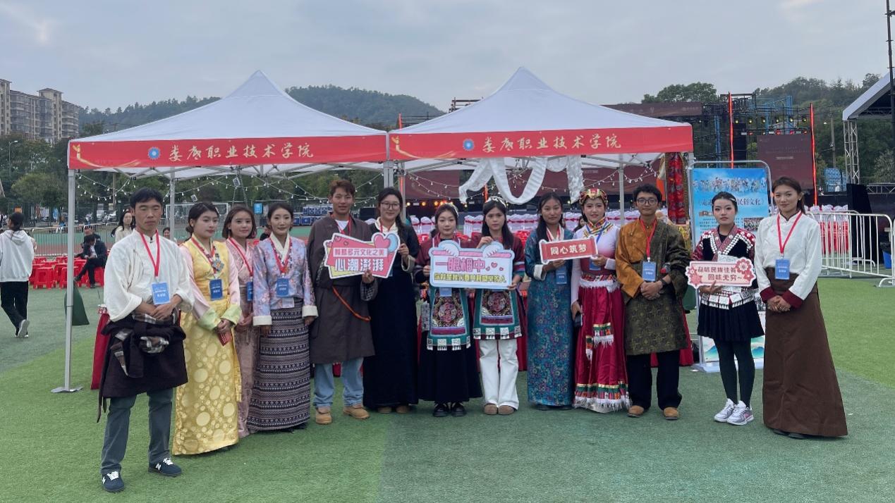 在现场展示体验活动中,19所高校的24个展位,按“56”字样精心排开,通过“静态展陈+动态演绎+交流互动”的方式,集中展现了各高校在铸牢中华民族共同体意识教育工作中取得的丰硕成果 。我校展位由多名民族学生带来民族服饰、舞蹈、美食展示,民俗知识宣讲,吸引了众多师生前来参观交流。