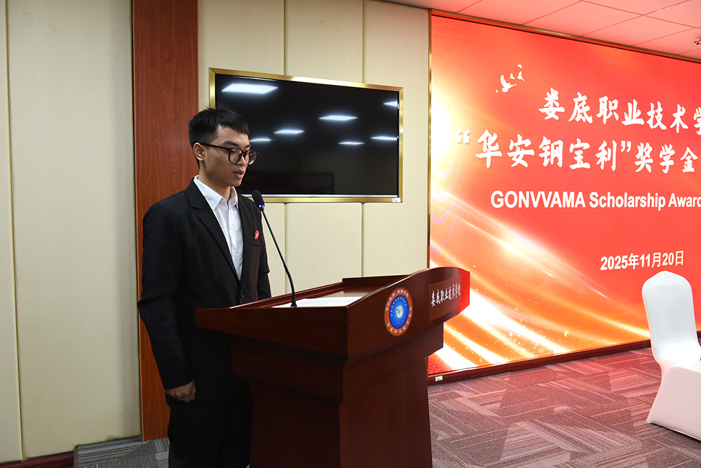 张征澜代表学校对GONVVAMA公司的支持表示感谢。他回顾校企合作历程时指出,自2024年2月签约以来,双方在产业学院建设、实习就业基地开发等领域已取得阶段性成果。针对获奖学生,他提出殷切期望,希望同学们将奖学金视为感恩奋进的动力,以扎实的专业技能回报社会,为娄底“材料谷”建设和地方经济发展贡献青春力量。同时强调,学校将主动加强与华安钢宝利衔接,为公司向更高水平迈进作出实际贡献。