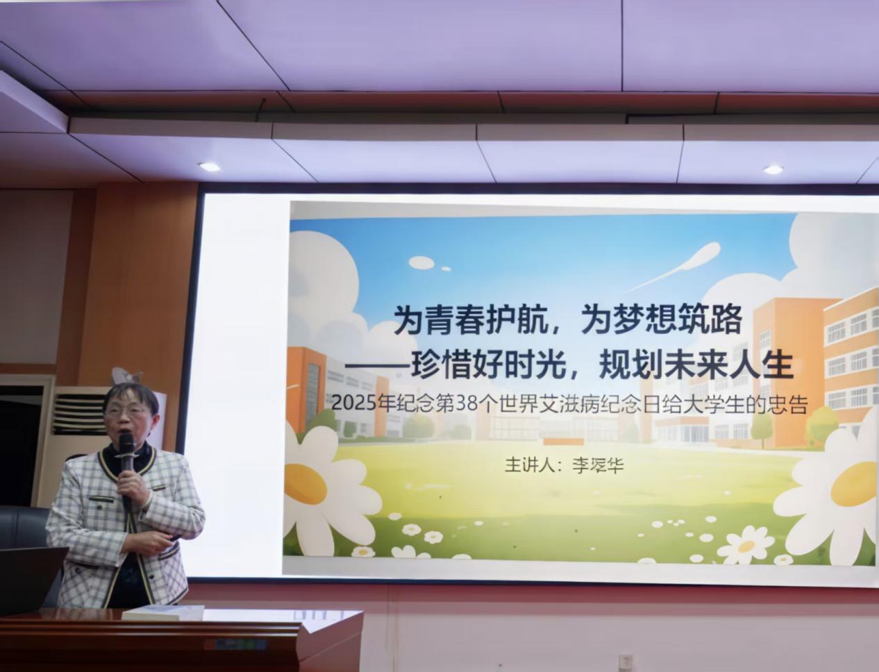 随后,李翠华带来预防艾滋病专题讲座,以专业视角为学生拨开认知迷雾。她紧扣青少年成长特点,用真实案例警示风险,打破“艾滋病离校园很远”的认知误区,让大家深刻意识到防艾工作的紧迫性与必要性。讲座中,李教授送上实用“青春护身符”:从清晰拆解“血液、性、母婴”三大核心传播途径,到着重强调“洁身自好、珍惜青春好时光,规划自己的人生,努力学习,安全套是防艾的好武器、坚决拒绝毒品”的防护底线,再到逐一澄清“日常接触会传染”等常见认知谬误,层层递进、深入浅出地引导学生构建科学防艾认知体系,掌握可操作的自我保护技能。互动问答环节中,同学们踊跃举手提问,李教授耐心答疑解惑,将专业知识转化为易懂的生活指引,让防艾理念真正入脑入心。