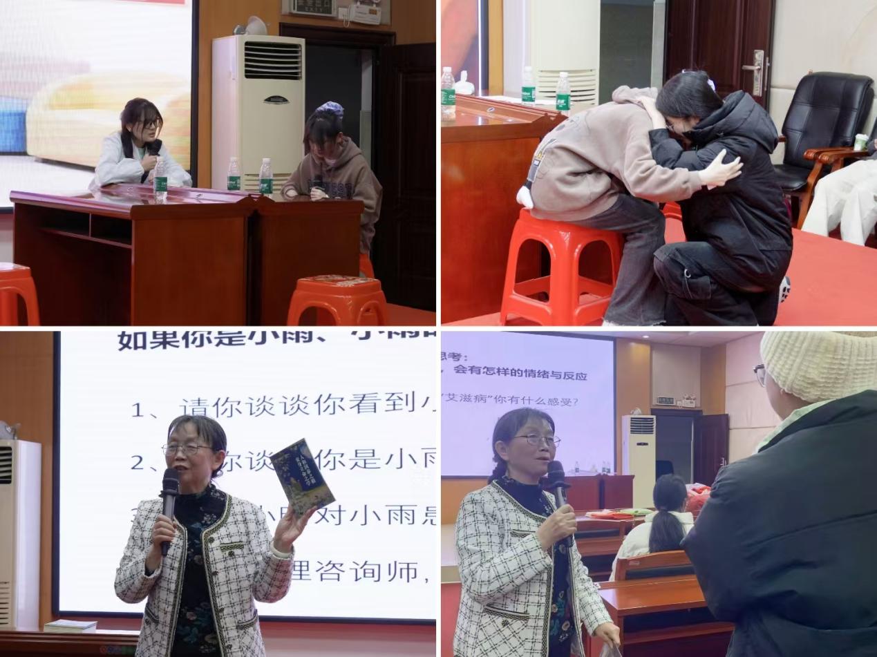 晚上7点,主教楼多功能报告厅内灯火可亲却气氛庄重,心理剧温情演绎与专题讲座深度科普相继登场,为娄底职院文化传播学院大一新生带来一场直击心灵的防艾教育活动。首先,由娄底慈爱社会服务中心负责人、国家二级心理咨询师、性教育高级讲师李翠华教授自编自导的心理剧《难以言说的“艾”》缓缓拉开帷幕。剧情聚焦大学生小莉因一时疏忽赴约酒吧、酒后失防感染艾滋病的经历(由外地某高校学生真实案例改编),通过她与挚友的外出、与母亲的情感碰撞、与医生的救赎对话,细腻勾勒出高危行为背后的沉重代价,生动再现了艾滋病感染者在身心双重困境中的挣扎与坚守。演员们全情投入的真挚演绎,将角色的痛苦、迷茫与重生诠释得淋漓尽致,报告厅内鸦雀无声,不少师生眼角泛红、潸然泪下。