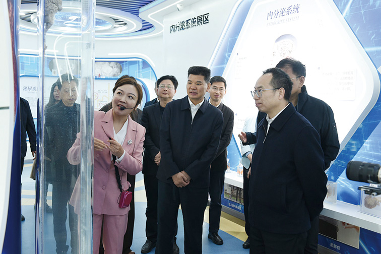 调研组首先考察了医学部生命科技馆。该馆以夯实康养知识根基为宗旨,融合基础医学、老年常见病防治与急救科普,并引入梅山中医药文化及临床解剖标本,体现了“医教协同、产教融合”的育人特色。