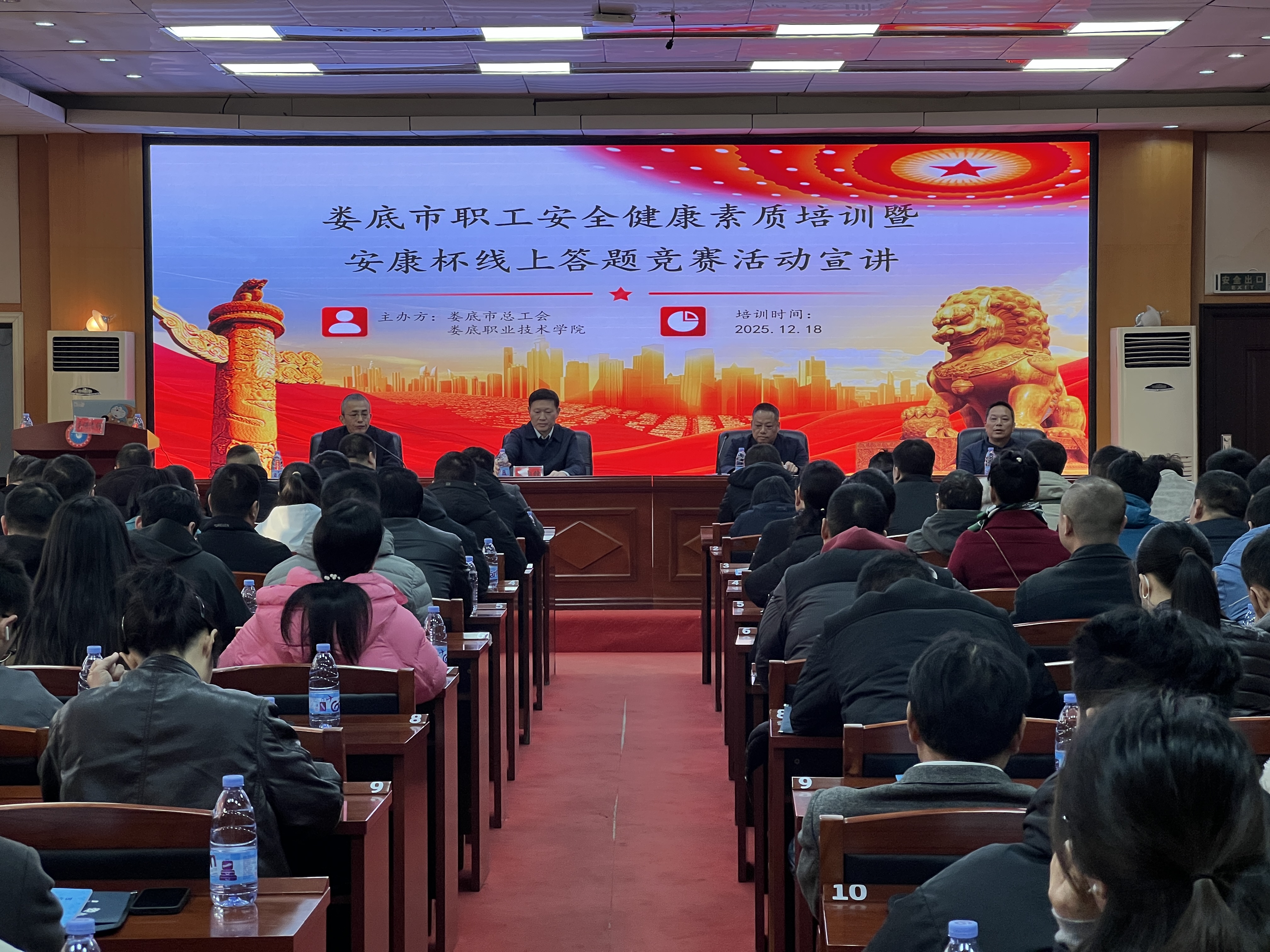 12月18日,由娄底市总工会委托、娄底职业技术学院安全培训与技术服务中心承办的全市重点行业企业职工安全健康培训在我校主教学楼多功能报告厅正式开班开讲。我校党委委员、副校长龙国锋,娄底市总工会副主席曾小尚、工会部长周建都出席开班仪式,安培中心负责人肖志江主持仪式,全市各重点行业企业参训职工代表参与。
