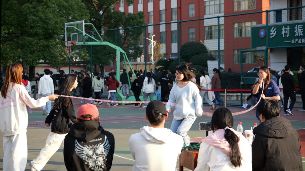 比赛现场高潮迭起,充分展现当代大学生的青春风采。单人跳绳赛场,选手们动作轻盈矫健,绳影翻飞间不断刷新纪录;长绳接力环节,摇绳手稳健发力,跳绳队员默契配合,即便偶有失误也能迅速调整状态,展现出顽强的团队协作精神。观众席上加油声、喝彩声此起彼伏,整个赛场洋溢着团结奋进的热烈氛围。