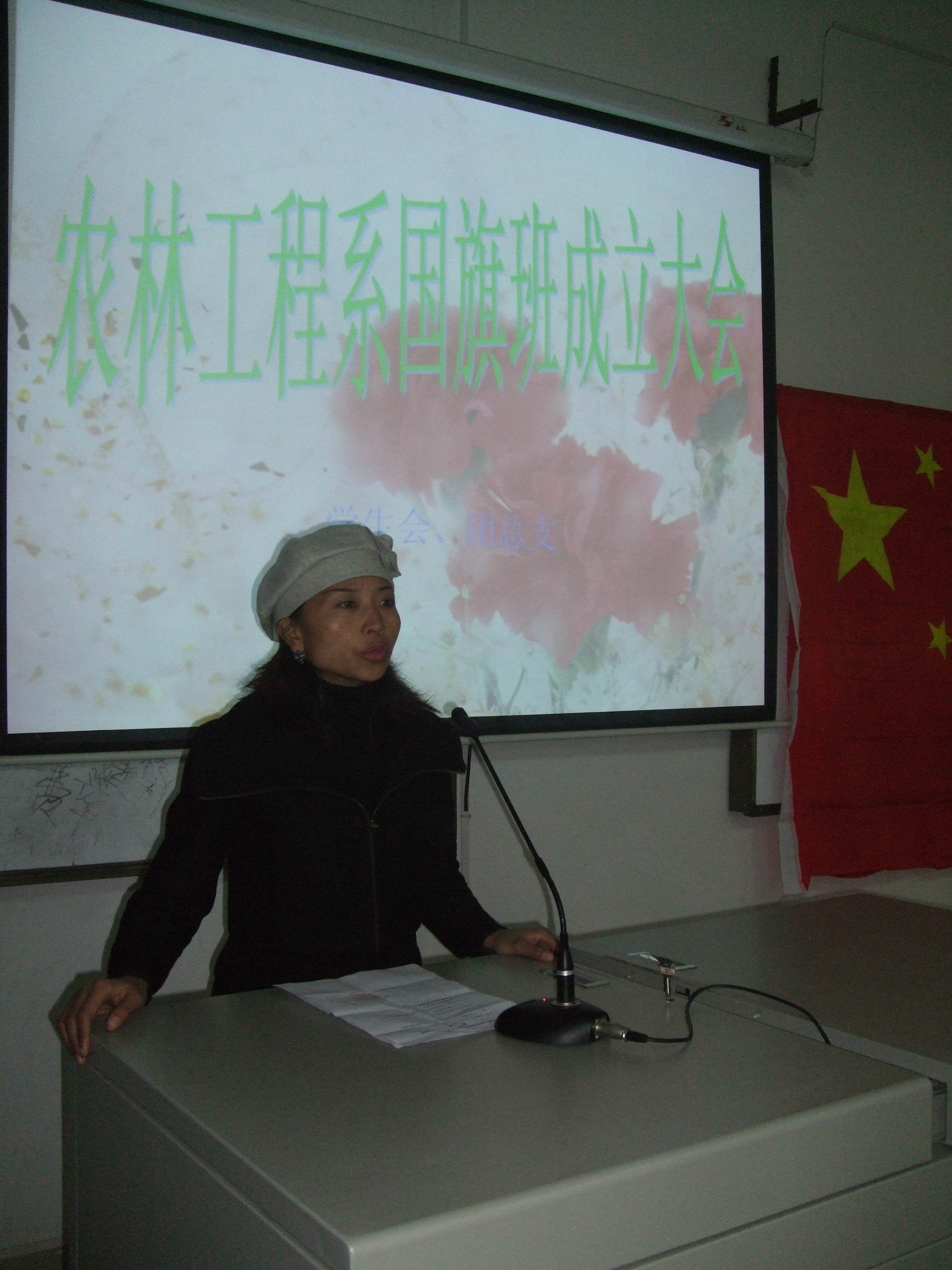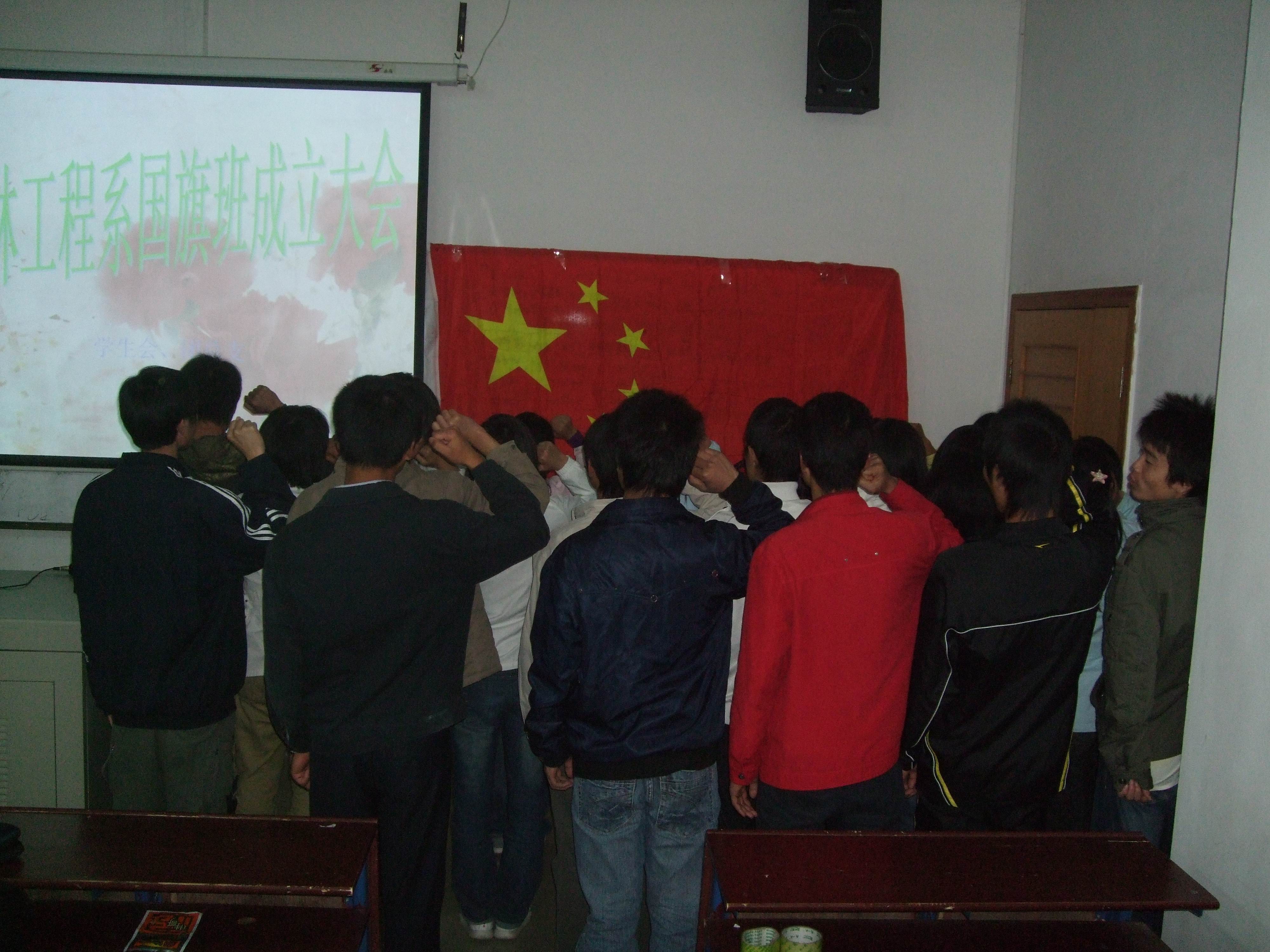 11月19日晚,由农林工程系学生会团总支精心组织的国旗班成立大会在主教学楼108室如期举行,大会上选举了国旗班班长,全体国旗班队员举行了庄严的宣誓仪式,学工主任罗莉萍强调了国旗班的纪律性并最后宣布农林工程系国旗班正式成立。