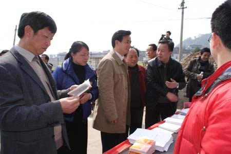 阳春三月,暖风和煦,龙塘镇农业合作社前的操坪上早已聚满了前来参加活动的村民。在当地村民表演了热情的花鼓戏等节目后,活动仪式正式开始。湖南省农业厅总农艺师刘年喜、娄底市政府副秘书长江克美分别发表讲话,指出科技下乡活动具有重要意义,它将切实提高广大农民科技素质,进一步增加科技在农业和农村经济发展中的含量,充分发挥科技在农业增效、农民增收中的支撑作用,营造全社会关心农村、支持农业、帮助农民,扎扎实实普及科学知识的良好氛围,希望广大科技人员加强科普宣传和科技推广、培训工作力度,要深入田间地头、养殖场地亲自示范操作,解决农民实际生产中的难题,注重实效。涟源市市长贺顺清对此次活动表示感谢,并代表涟源市人民表达了加快发展、繁荣农业、繁荣经济的决心。仪式上,湖南省农业厅总农艺师刘年喜、娄底市政府副秘书长江克美、涟源市市长贺顺清、湖南人文科技学院院长柏连阳、我院院长杜祥培、娄底市农业局局长胡绍华、涟源市市委常委、副市长邱化姣为农户代表发放了农用物资。仪式由娄底市农业厅科教处处长左平权主持。 活动现场人头攒动,我院的展台前更是聚集了大批村民。他们翻阅着我院农林系专门制作的种植技术资料汇编,认真咨询了许多农业技术难题。据农林系主任李九如介绍,本次我院共组织发放了200余册技术资料及农业政策宣传手册,技术资料根据娄底市农业特色选编,以葡萄、油茶、水稻、柑橘的施药、抗病、增产等技术指导为主,具有极高的针对性,实用价值很强。