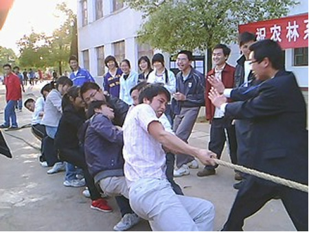 拔河比赛使整个赛场沸腾,将每位参赛队员的激情推向了顶点。各组参赛队员拼尽全力,在场上奋力拼搏,场外的啦啦队不断地呐喊助威。赛场上的每一个人都把自己的全身力气使在那根长长的绳子上,同时每一个人的心也被紧紧的系在了一起,一心为荣誉而顽强拼搏。经过多轮的角逐,09畜牧大一班一路过关斩将,最终取得该项赛事的冠军,09园林大一班、08园林大一班分获亚军、季军。(何甜甜 易瑜)