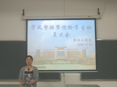 5月12日晚7:30,我系在主教楼110举行了示范性院校年度检查迎检学生动员大会。学工主任易瑜、辅导员康和英、李向勇和我系全体学生共230余人参加了会议。会议由学工主任易瑜主持。 学工主任易瑜首先公布了开学以来各班早操出操、课堂出勤、晚就寝情况。对《娄底职业技术学院学生手册》中涉及到学习纪律的要求作了详细的解释和说明,同时对各班考勤方式和考勤办法作了明确要求,强调了学院对将进一步狠抓考勤,严肃考风考纪的决心,明确了将把学风建设作为一项重点和基础工作常抓不懈。并对在座的学生提出了两点要求:一、充分认识到学风建设的重要性,以高度的责任感和危机感承担责任,紧抓班级的学风建设;二、以身作则,以自己的一言一行带动、影响身边的同学。 随后易瑜作了迎检动员讲话,就迎检的重要性,示范性院校年度检查的目的,进行了介绍和分析。围绕怎样迎接此次年度检查做了一系列工作安排,包括出操、上课、寝室文化、安全等方面。要求在座的全体同学把会议精神落实到行动,为学院迎检尽一份力,做出应有的贡献。 辅导员康和英针对学风建设及迎检做工作安排。(何甜甜 李小玉)