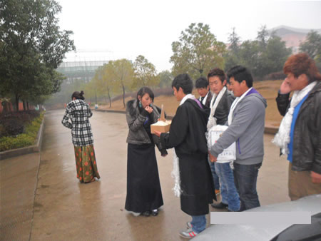 藏族同学们热情的给大家敬酒,教大家喝酒的藏族风俗步骤:先用本人右手的无名指蘸上酒,向天空弹三下,算是敬天、敬地、敬祖先,然后“三口一杯”, “三口一杯”是指主人斟满酒,客人小酌一口,主人再为客人倒满,如此重复三次后,客人才能杯中的酒全部喝干。