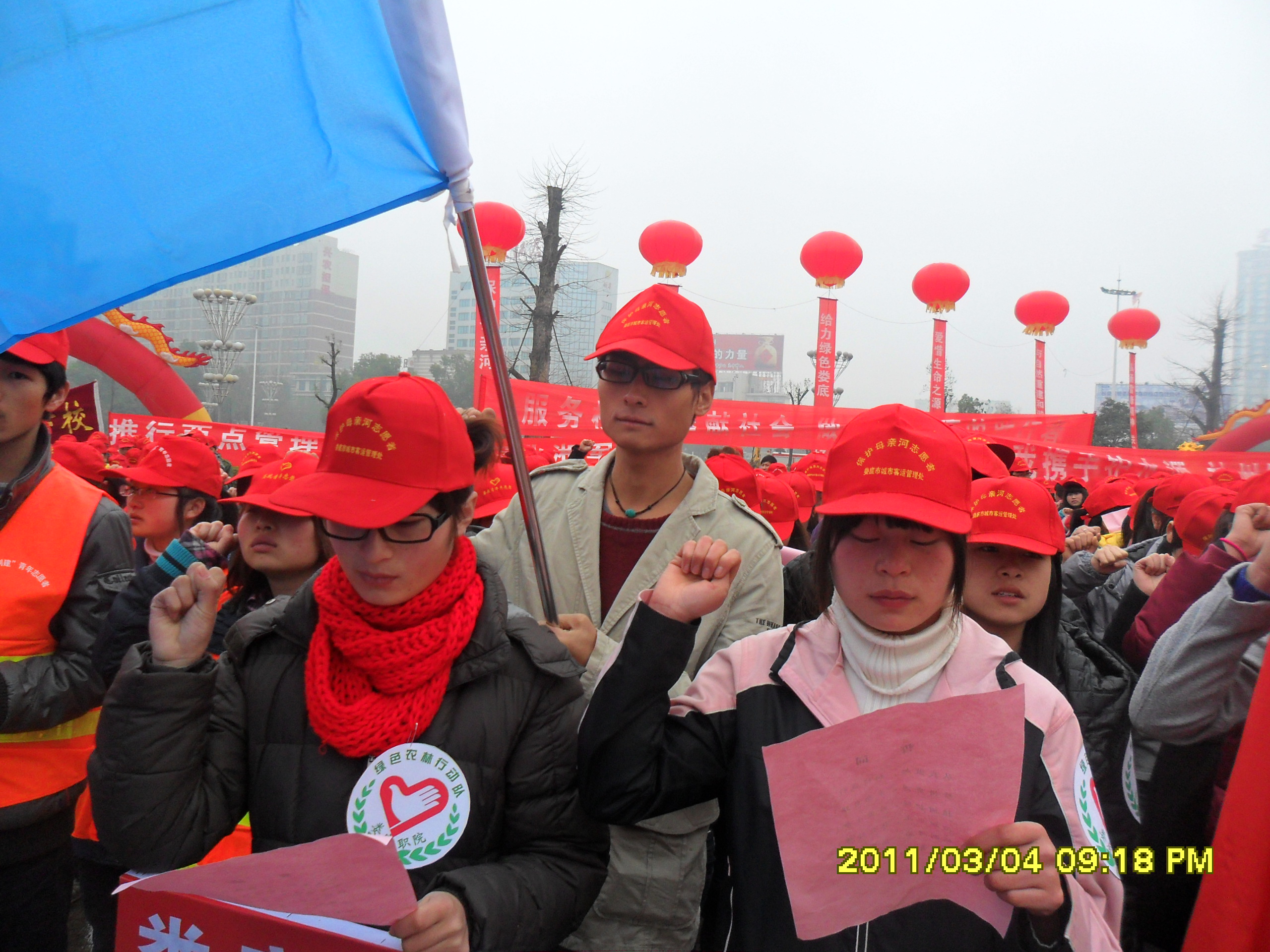 代表我院参与这次活动的农林系志愿者们所戴农林绿色行动队徽章在一片志愿者小红帽中格外醒目。志愿者举起右手,庄严宣誓:保护母亲河,还母亲 河一片洁净的生态环境。