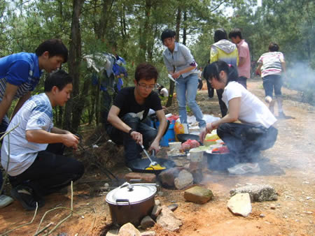 本次活动分为三个阶段:野炊食材准备阶段,包括“菜市场采购大比拼”、“找鸡蛋比赛”、“钓鱼比赛”;野炊阶段,包括“切菜比赛”、“炒菜比赛”、“生火比赛”;趣味训练阶段,包括“兔子舞”、“打水漂”、“瞎子背瘸子”。