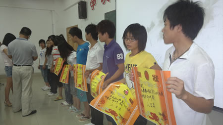 易瑜宣读了获得本届寝室文化建设月系列活动:“优秀文明寝室”、“趣味运动会”、“我的寝室我的家”演讲比赛、“才男巧女”寝室文化作品展的获奖名单。江国元为获奖的优秀寝室代表和个人颁发了奖状及荣誉证书。