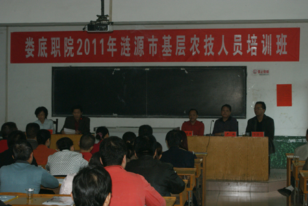 本次培训是按照《湖南省2011年基层农技推广体系改革与建设示范县基层农技人员培训实施方案》的通知精神,由涟源市农业局及各乡镇农技站选送的97名技术骨干集中培训与考察,由湖南省现代农业技术培训基地?D?D娄底职业技术学院承办。主要讲授现代农业推广服务的理论、方法与模式、现代农业与新农村建设、现代农业信息化服务技能与实践、甜玉米与特种蔬菜栽培、水稻黑条矮缩病防治、金银花品种及栽培要点等课题,目的是为了提高涟源市基层农技推广人员的理念与素质技能,更新观念、提升理念、增强服务能力,促进科技成果快速转化,真正让基层农技员在涟源市的现代农业建设进程中发挥应有的作用。(农林系)