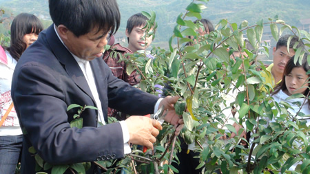 参观完合作社的办公楼,大家向下一站金银花生产基地进发。山路越崎岖,风景越美丽,呼吸山间清新空气,观赏层碧花草树木,是紧张专业学习之余无上的身心享受。10:30分到达的金银花生产基地,映入眼帘的是漫山遍野的金银花树,生机盎然,很是壮观。梁总带领大家下到地里为大家讲解金银花根砧嫁接繁殖、栽培技术。梁总自豪的说:“根砧嫁接不仅缩短了苗木出圃时间,还很大的提高了苗木成活率。培育出来的新品种金银花的品质和有效成份含量以及金银花的产量都有很大的提升。”说着不忘蹲下来给大家介绍金银花的品种和栽培技术要点,并亲自示范了金银花的修剪技术,和曾玉华老师就金银花养护管理技术进行了交流。涟源市的电视台记者对同学们进行了采访,了解大家对本次参观和学习的感受。“梁总的热情和朴实让大家都倍感亲切,大家问梁老师的问题他也都又问必答,就像师生一样相处得默契和自然。”