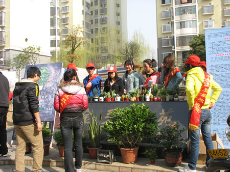 从9点半到15点半的整整5个小时里,队员们忙于而不乱的清点废品、过称、计价、宣传讲解、给买了植物和花盆的居民们进行就地换盆、上门回收废品、送大型植物上门、从娄职景来公司花卉基地运植物、清理废品、送废品到回收站,脚不沾地。有些队员为准备活动早餐也没吃,到这时实在抗不住了,只好一个轮一个的去吃。而大多数队员根本就没有时间去吃中餐。期间,植物几次换完了,队员们想就此结束活动都未成功,更多的居民手里拿着各种废品前来兑换。此时队员们看见的已经不止是本区的居民,还有其他社区的居民。居民们的参与热情促使队员们一次次驾着三轮车往返于娄职景来公司花卉基地、“金碧文苑”社区之间搬运盆栽。