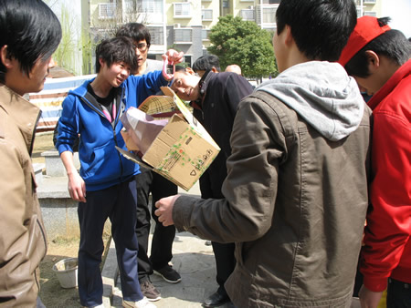 从9点半到15点半的整整5个小时里,队员们忙于而不乱的清点废品、过称、计价、宣传讲解、给买了植物和花盆的居民们进行就地换盆、上门回收废品、送大型植物上门、从娄职景来公司花卉基地运植物、清理废品、送废品到回收站,脚不沾地。有些队员为准备活动早餐也没吃,到这时实在抗不住了,只好一个轮一个的去吃。而大多数队员根本就没有时间去吃中餐。期间,植物几次换完了,队员们想就此结束活动都未成功,更多的居民手里拿着各种废品前来兑换。此时队员们看见的已经不止是本区的居民,还有其他社区的居民。居民们的参与热情促使队员们一次次驾着三轮车往返于娄职景来公司花卉基地、“金碧文苑”社区之间搬运盆栽。