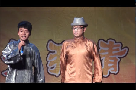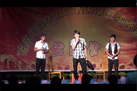 接下来的文艺汇演,来自11园林工程班的舞蹈《床前明月光》一亮相就让晚会现场激情四射;由11园林规划班花艳超、11畜牧班曾钊表演的双簧《打电话》幽默诙谐;辅导员与班长同台朗诵《青春赞歌》大气磅礴;10园林班的《秦蔡有约》来源生活,让同学们不由会心一笑;11园林规划班的藏族姑娘元旦卓玛送上了高亢激昂的《高原红》;学生会团总支《非“雷”勿扰》各种“雷人”,引得现场观众尖叫声、掌声不断; 11畜牧班藏族姑娘小伙送上的歌伴舞《歌舞的海洋》更是将晚会推向了高潮。