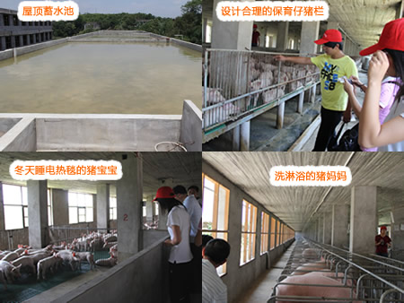 在猪舍的降温方面,除了屋顶有隔温板和装有风扇外,在种公猪,经产母猪和怀孕母猪舍还装有冷风机,在经产母猪舍还装有滴水降温系统,滴水降温就是和园林上的滴灌技术差不多,就是将水滴在经产母猪的颈部用于降温。对经产母猪施行滴水降温主要是为了给刚产出的仔猪保温,因为母猪需要降温而仔猪却相反要保温,而恰好滴水降温技术能达到这个要求。在怀孕母猪舍还采用了喷雾降温系统,采用喷雾降温五分钟就能使整个猪舍的气温降下来,每次十分钟,这样可以节水80%。