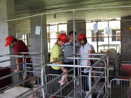 7月4日下午2:30,我院农林系大学生暑期“三下乡”社会实践“科技兴农”服务队队员和指导老师易瑜、李继仁、毛寿林在蛇形山镇团委书记朱湘伟、蛇形总支副书记曹水平、镇畜牧站副站长朱红伟的陪同下驱车前往双峰县养猪规模最大的养殖户鑫源牧业公司所在的石湾村。
