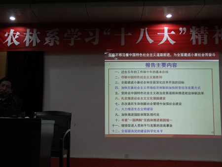 为深入学习贯彻十八大报告及其精神,12月19日晚,工会主席曾国基在主教楼多功能报告厅为我系党支部教师党员、学生党员、重点培养对象、入党积极分子作了学习“十八大”精神专题讲座。