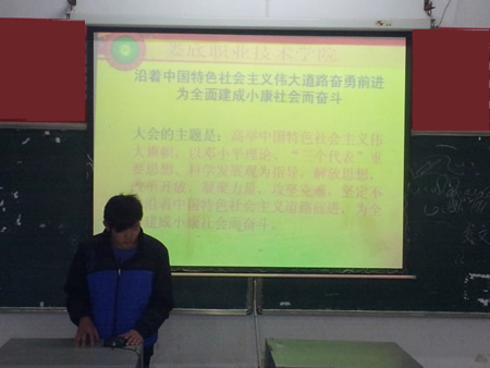 会上,各班就十八大的具体内容进行了详细讲解,对十八大精神展开了深入探讨,并对如何贯彻十八大精神作了具体剖析。在观看有关十八大的视频以及材料后,同学们积极展开讨论,踊跃发表自己的看法,抒发内心的真情实感,表达自己对十八大精神的理解。大家都表示,十八大的精神应该延续下去,并渗透到学习和生活的各个方面,作为大学生应该认真学习,从现在做起,从身边小事做起,努力迎接学业和事业的双丰收。不少班级还通过游戏、签名、有奖竞答等生动活泼的形式让同学们更形象地了解十八大,表达对党的热爱。