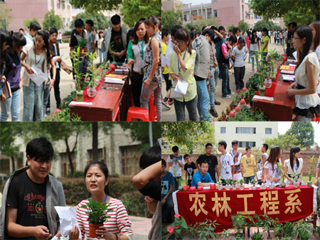 学生会代表们提前进行场地布置,并设置了服务台以方便大家询问植物养护方面知识。此次绿色兑换主要由12级学生会成员负责,11级学姐学长其中协助。