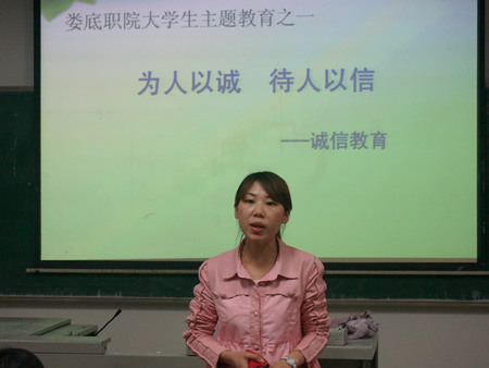 辅导员们首先通过PPT展示,从诚信的内涵、诚信的意义、大学生诚信现状以及如何加强修养,诚信做人四个方面进行引导,然后针对各班实际班情提出了具体要求,结合诚信的热点时事,进行深入探讨,气氛热烈。最后,辅导员们向各班高校生生源地信用助学贷款的学生发出了诚信做人、按时还贷的号召。