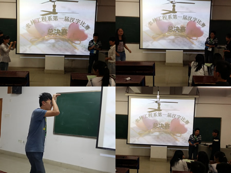 为了更好的传播中国汉字,体会汉语的博大精深,5月16日中午,我系首届汉字大赛决赛在主教学210举行,我系易瑜副主任,学工干事颜勤老师,各班学生代表观看了本场比赛。